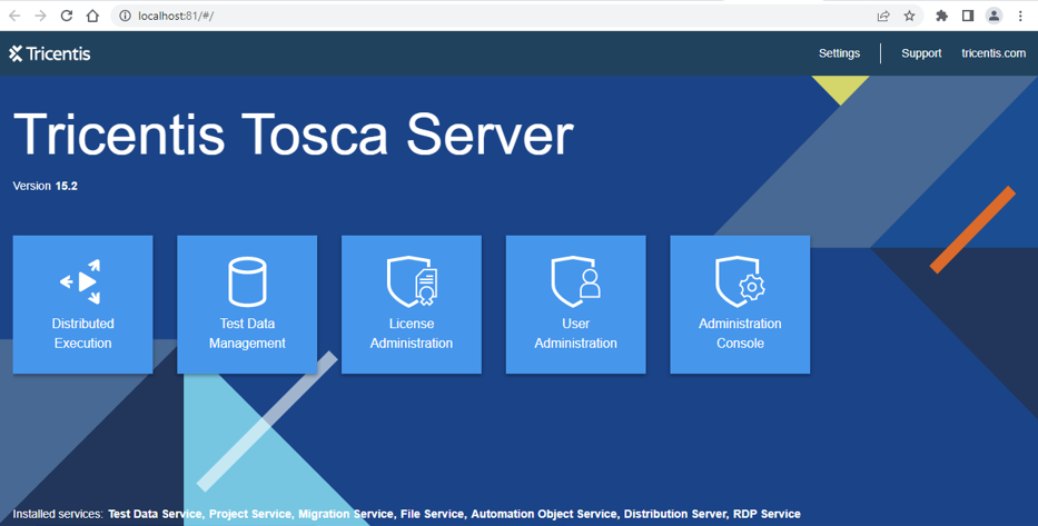 8. Open Tosca Server in your browser and Open the Tosca Server settings page in your browser.